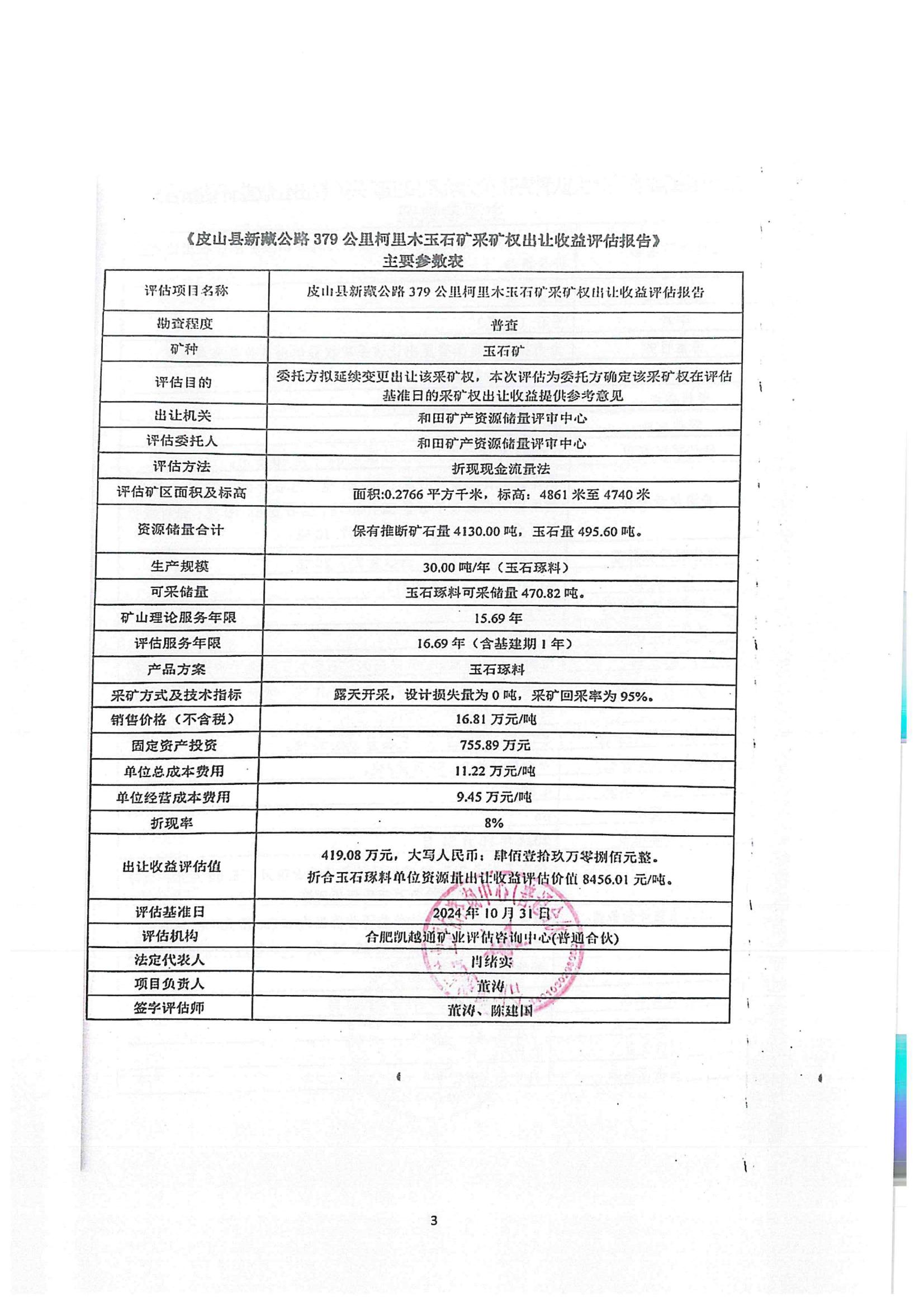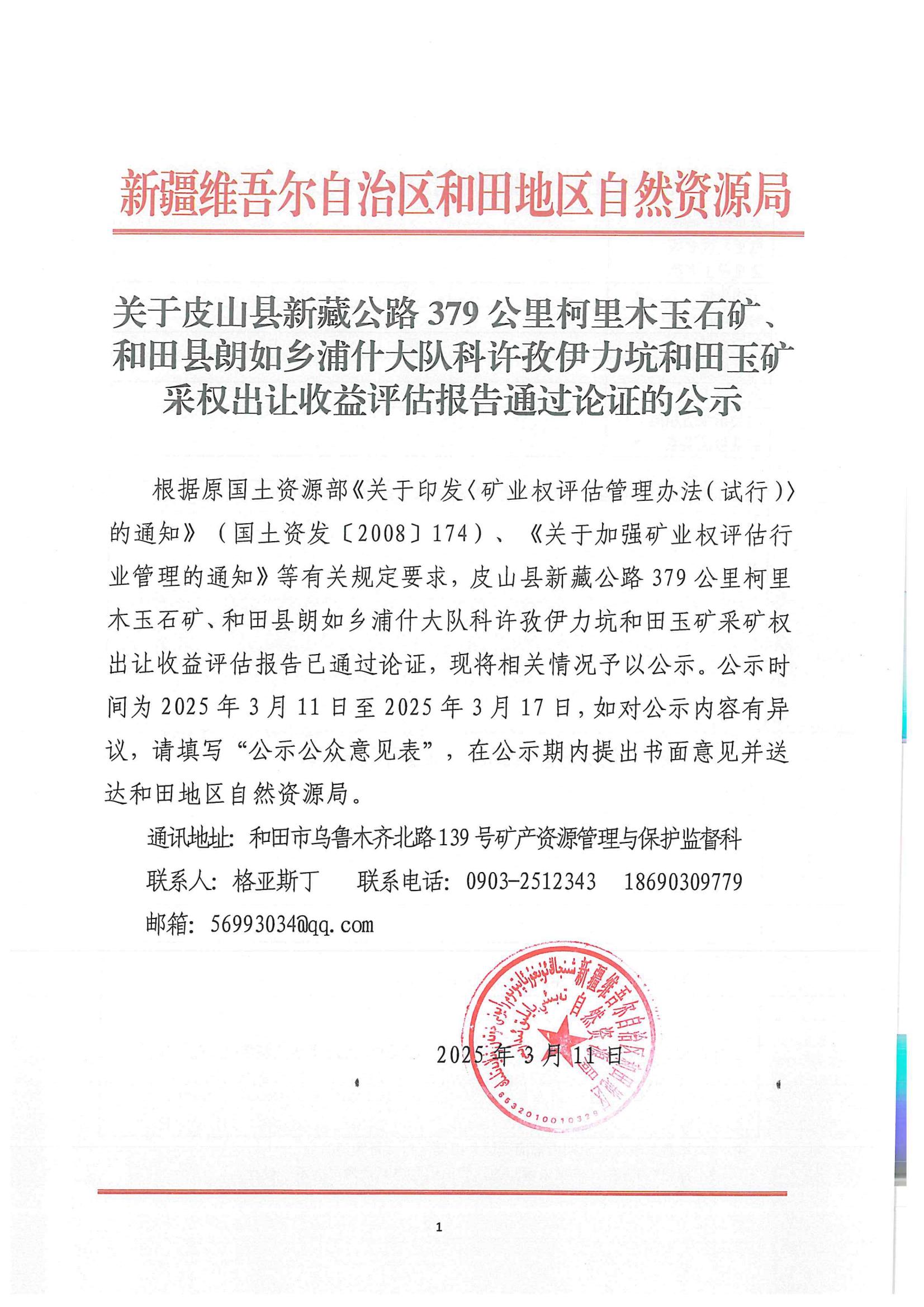 關(guān)于皮山縣新藏公路379公里柯里木玉石礦、和田縣朗如鄉(xiāng)浦什大隊(duì)科許孜伊力坑和田玉礦采權(quán)出讓收益評(píng)估報(bào)告通過(guò)論證的公示