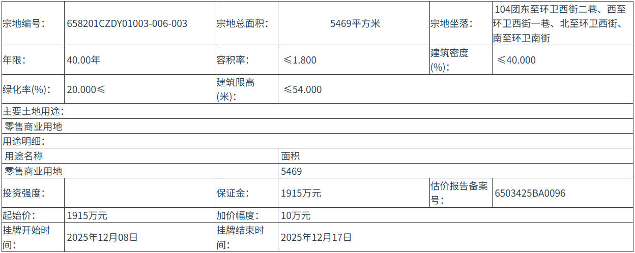 四、 本次掛牌出讓的詳細(xì)資料和具體要求,見掛牌出讓文件。申請人可于 2025年11月16日 至 2025年12月15日 到 第十二師自然資源和規(guī)劃局 獲取 掛牌出讓 文件。