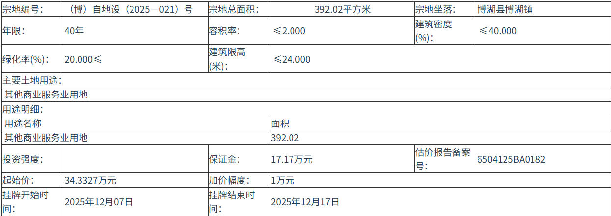 (博)自地設(shè)(2025—021)號 號地塊:2025年12月07日 10時(shí)00分 至 2025年12月17日 12時(shí)00分;