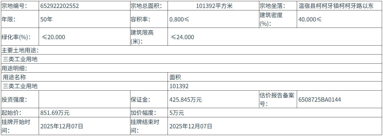 四、 本次掛牌出讓的詳細(xì)資料和具體要求,見掛牌出讓文件。申請(qǐng)人可于 2025年11月17日 至 2025年12月06日 到 溫宿縣自然資源局 獲取 掛牌出讓 文件。