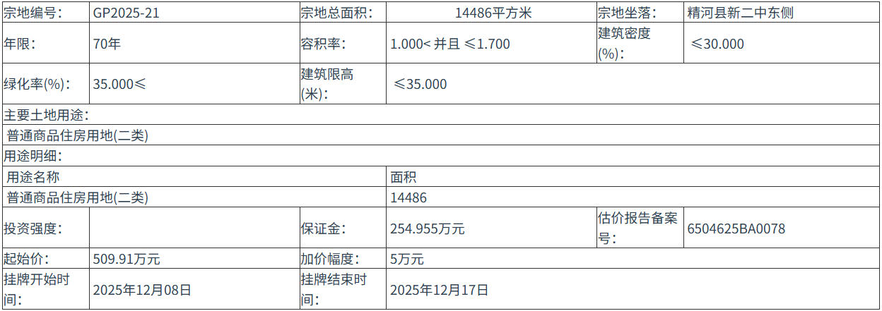GP2025-21 號(hào)地塊:2025年12月08日 00時(shí)00分 至 2025年12月17日 00時(shí)00分;