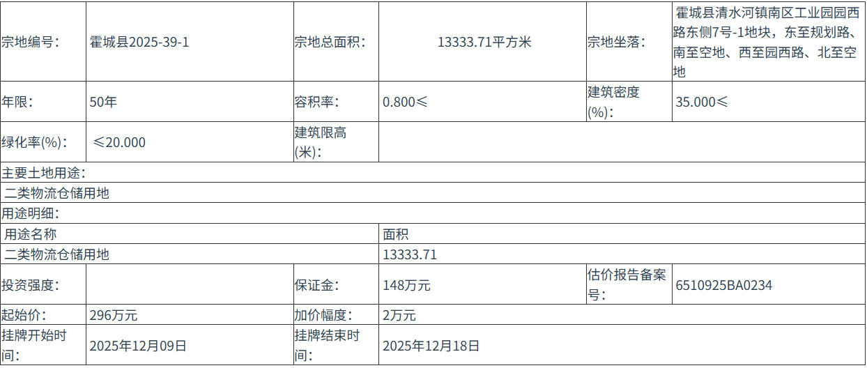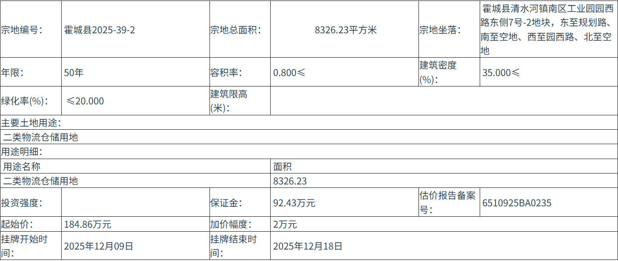 霍城縣2025-39-2 號(hào)地塊:2025年12月09日 10時(shí)00分 至 2025年12月18日 12時(shí)00分;