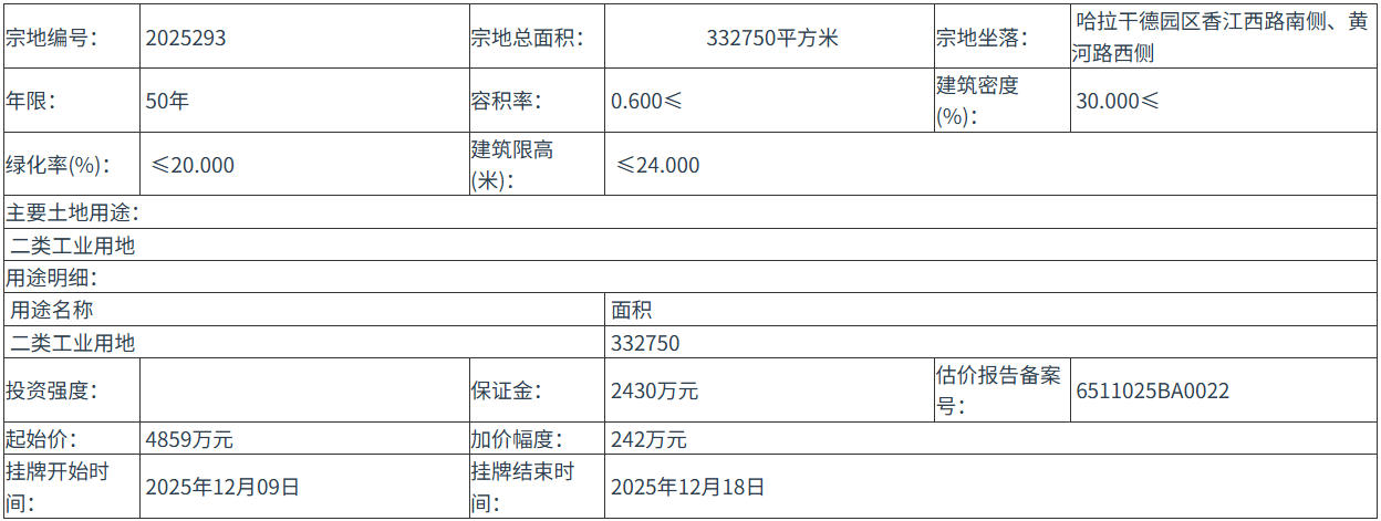 2025293 號(hào)地塊:2025年12月09日 11時(shí)00分 至 2025年12月18日 18時(shí)00分;