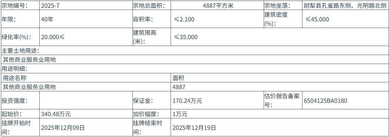 2025-7 號地塊:2025年12月09日 10時00分 至 2025年12月19日 12時00分;