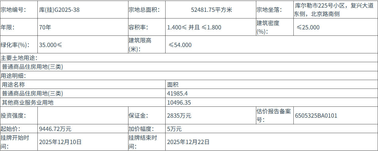 四、 本次掛牌出讓的詳細資料和具體要求,見掛牌出讓文件。申請人可于 2025年11月20日 至 2025年12月09日 到 庫爾勒市索克巴格路巴州住建大廈11樓1118室 獲取 掛牌出讓 文件。