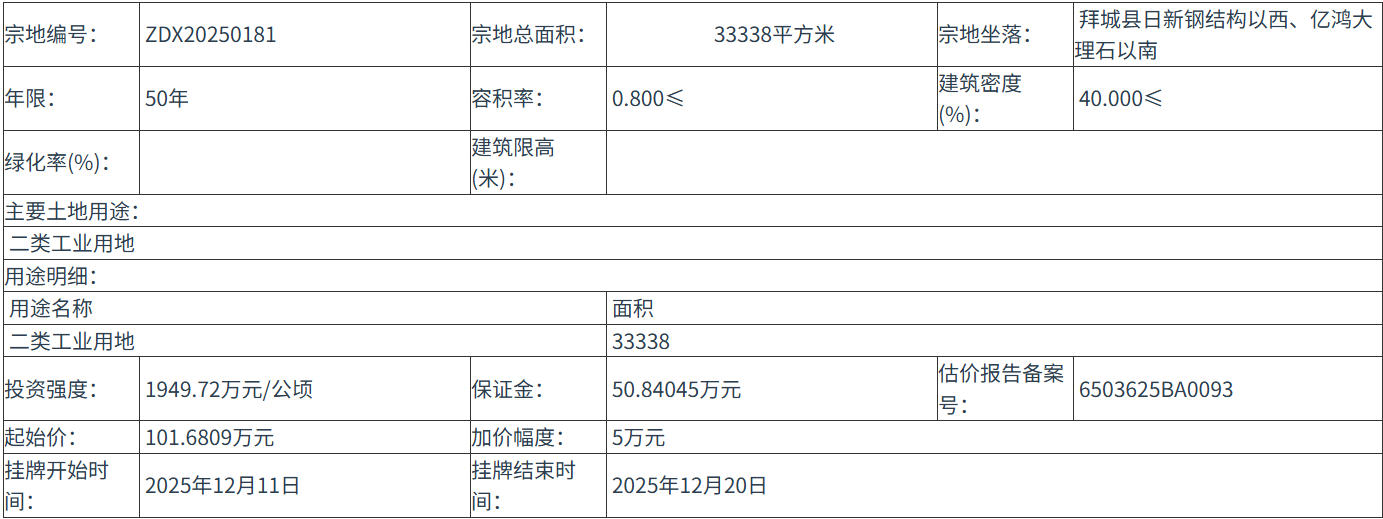 四、 本次掛牌出讓的詳細資料和具體要求,見掛牌出讓文件。申請人可于 2025年11月21日 至 2025年12月10日 到 拜城縣自然資源局 獲取 掛牌出讓 文件。