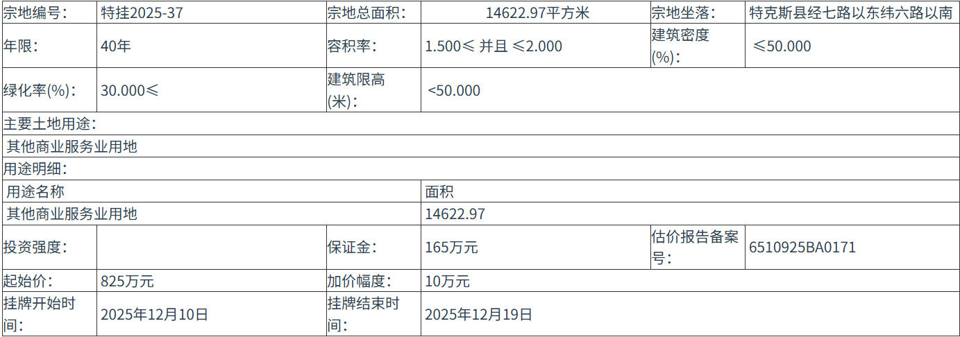 五、 申請人可于 2025年12月10日 至 2025年12月17日 到 特克斯縣自然資源局土地儲備交易中心 向我局提交書面申請。交納競買保證金的截止時間為2025年12月17日 18時00分 。經(jīng)審核,申請人按規(guī)定交納競買保證金,具備申請條件的,我局將在 2025年12月17日 20時00分 前確認(rèn)其競買資格。