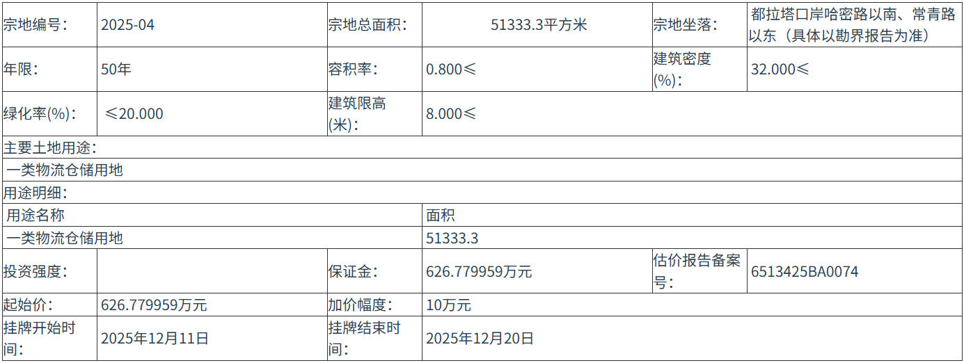 四、 本次掛牌出讓的詳細(xì)資料和具體要求,見掛牌出讓文件。申請人可于 2025年11月21日 至 2025年12月10日 到 伊犁州自然資源局都拉塔口岸分局——土地利用科 獲取 掛牌出讓 文件。