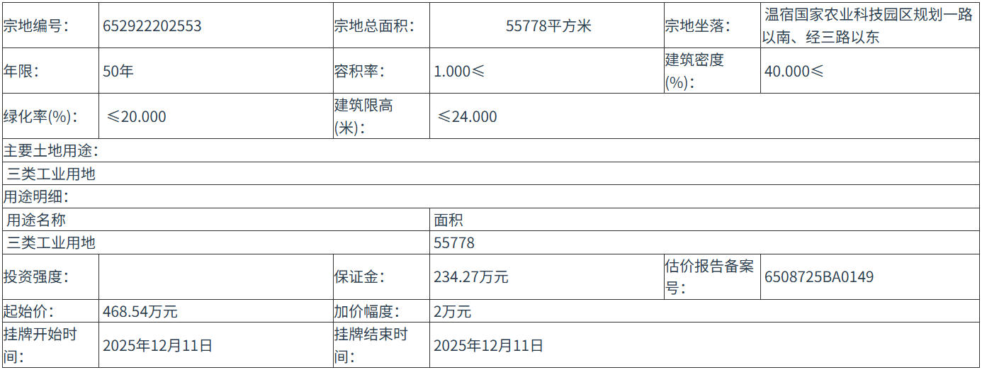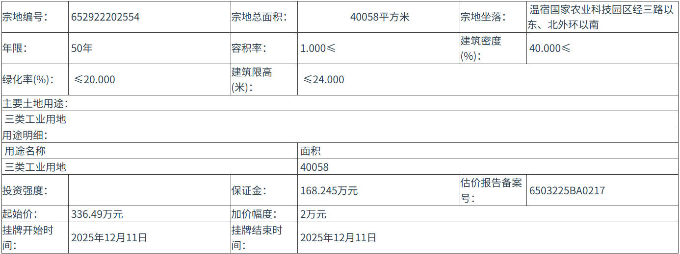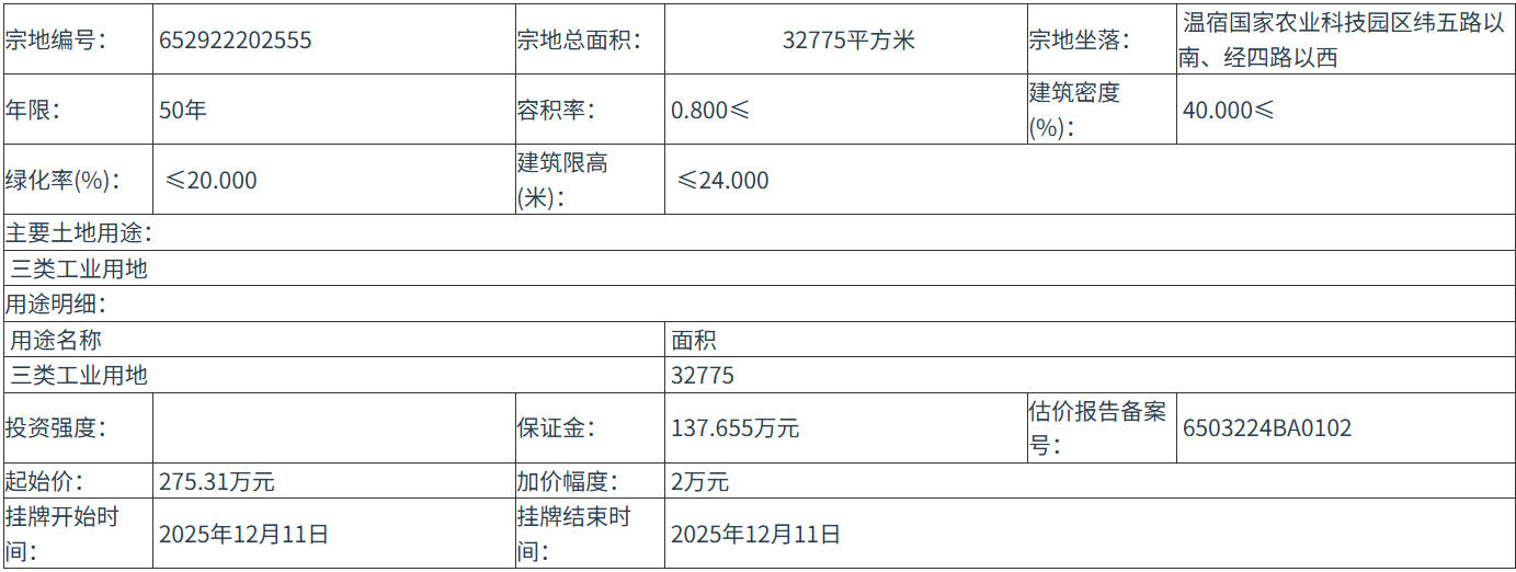 四、 本次掛牌出讓的詳細(xì)資料和具體要求,見掛牌出讓文件。申請(qǐng)人可于 2025年11月21日 至 2025年12月10日 到 溫宿縣自然資源局 獲取 掛牌出讓 文件。