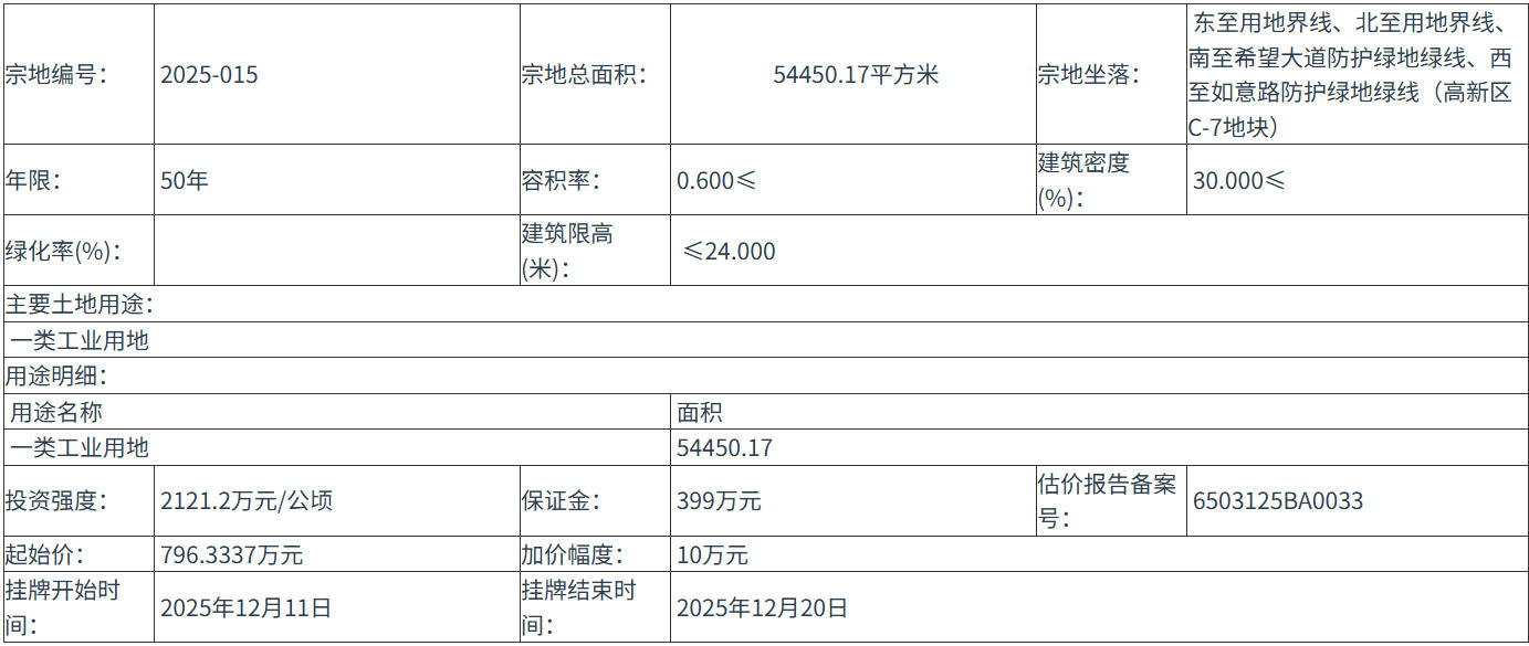 四、 本次掛牌出讓的詳細(xì)資料和具體要求,見掛牌出讓文件。申請人可于 2025年11月21日 至 2025年12月18日 到 昌吉回族自治州自然資源局昌吉高新技術(shù)產(chǎn)業(yè)開發(fā)區(qū)分局(人才大廈406室) 獲取 掛牌出讓 文件。