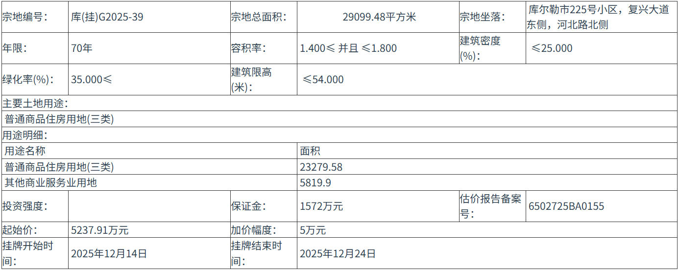 四、 本次掛牌出讓的詳細(xì)資料和具體要求,見掛牌出讓文件。申請(qǐng)人可于 2025年11月24日 至 2025年12月13日 到 庫爾勒市索克巴格路巴州住建大廈11樓1118室 獲取 掛牌出讓 文件。