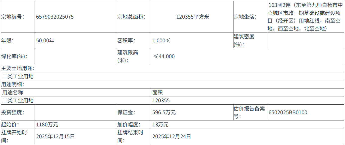 受讓人在出讓宗地范圍內(nèi)新建建筑物時,建筑系數(shù)不得低于40%,投資強度不低于750萬元/公頃,主體建筑物所占用地性質(zhì)為工業(yè)用地(農(nóng)副產(chǎn)品加工廠)。 本次掛牌出讓的詳細資料和具體要求,見掛牌出讓文件和宗地規(guī)劃設計條件,申請人可于報名期間到第九師白楊市自然資源和規(guī)劃局獲取相關文件。