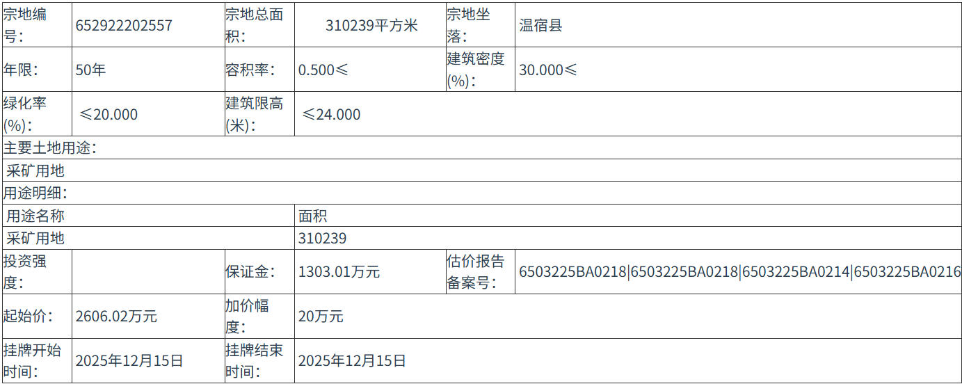 四、 本次掛牌出讓的詳細(xì)資料和具體要求,見(jiàn)掛牌出讓文件。申請(qǐng)人可于 2025年11月25日 至 2025年12月14日 到 溫宿縣自然資源局 獲取 掛牌出讓 文件。